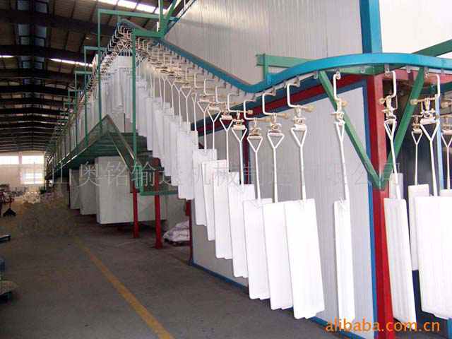 即普通懸掛輸送機(jī),由架空軌道、牽引鏈、滑架、吊具、改向裝置、驅(qū)動(dòng)裝置、張緊裝置和安全裝置等組成。架空軌道構(gòu)成閉合環(huán)路,滑架在其上運(yùn)行。各滑架等間距 地聯(lián)接在牽引鏈上。牽引鏈通過水平、垂直或傾斜的改向裝置構(gòu)成與架空軌道線路相同的閉合環(huán)路。